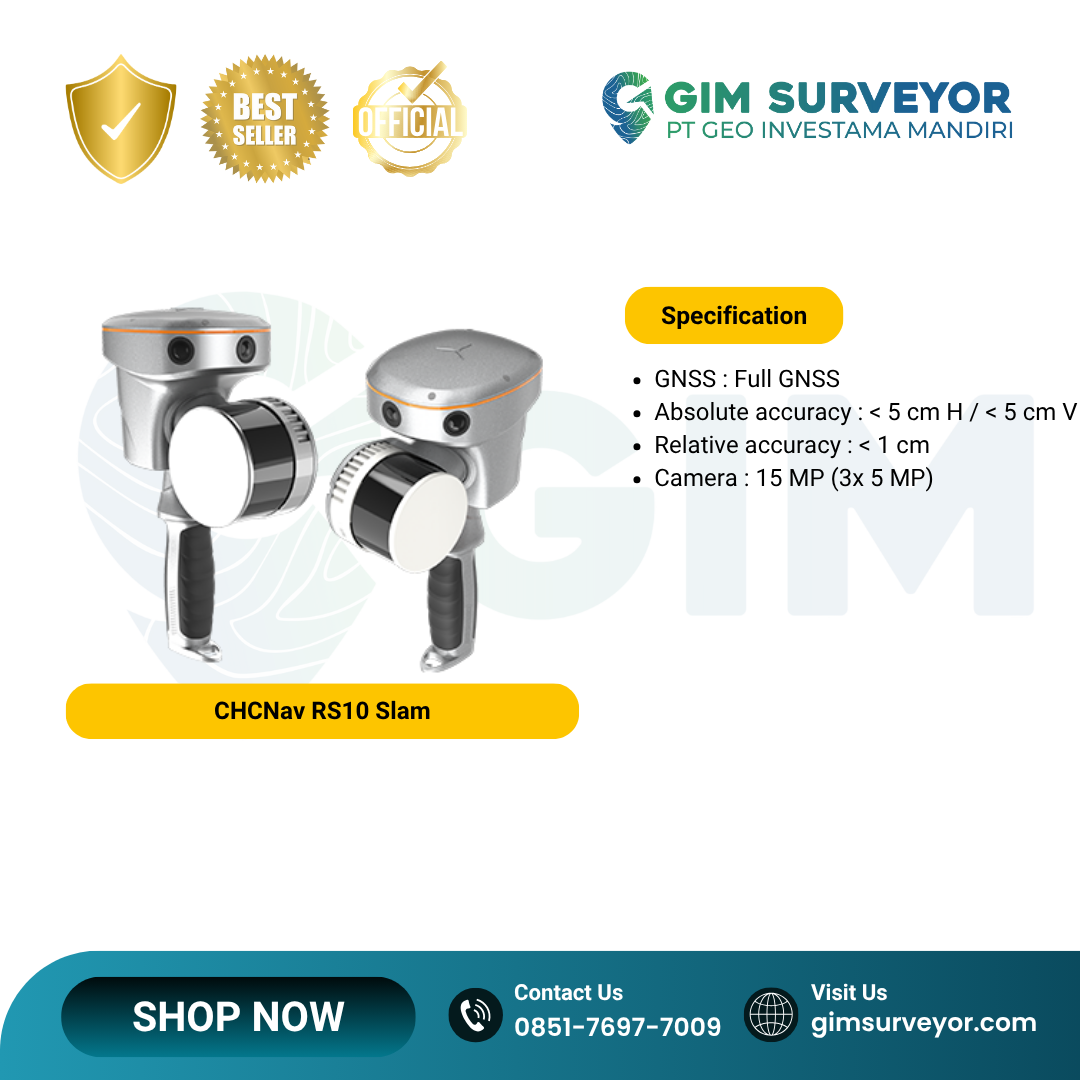 CHCNAV RS10 SLAM adalah scanner 3D handheld (atau portable) yang mengintegrasikan modul GNSS RTK, scanner laser LiDAR, serta algoritma SLAM (Simultaneous Localization And Mapping) dan kamera visual dalam satu perangkat. Produk ini dirancang untuk survei geospasial, pemetaan manajemen infrastuktur, BIM (Building Information Modeling), pemetaan dalam ruang terbuka maupun tertutup, termasuk area yang memiliki hambatan sinyal GNSS.